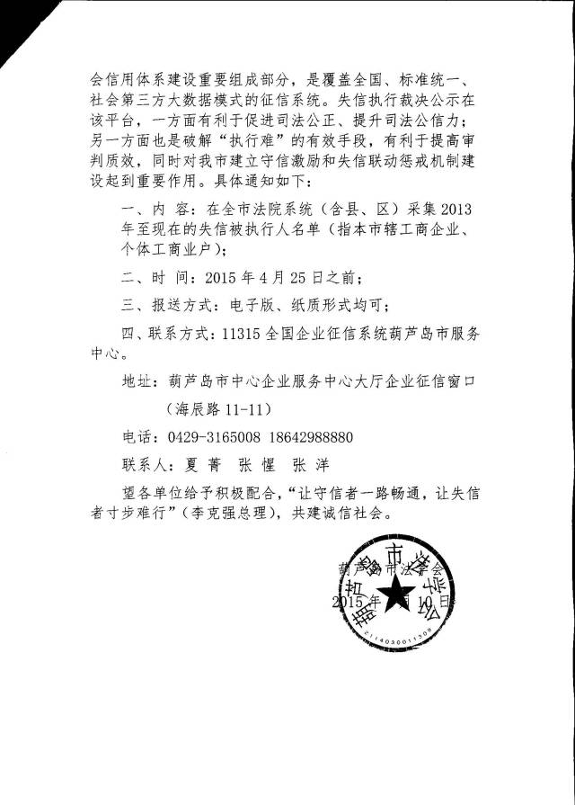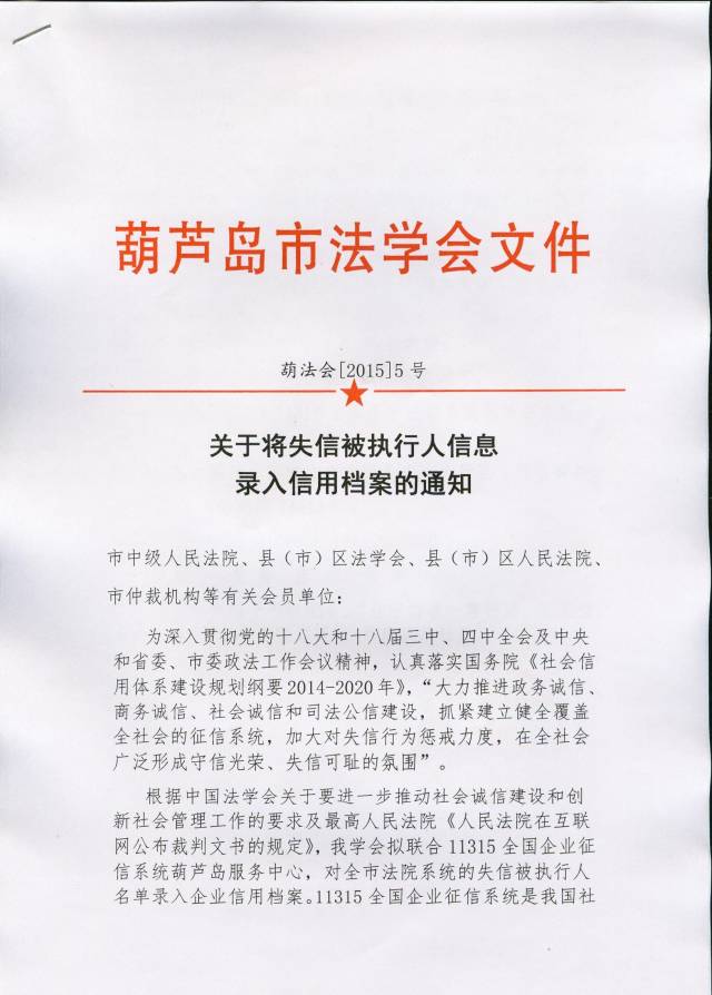 近日,辽宁省葫芦岛市法学会正式下发文件,将全市法院系统的失信被执行人名单录入11315全国企业征信系统,面向社会进行公示。