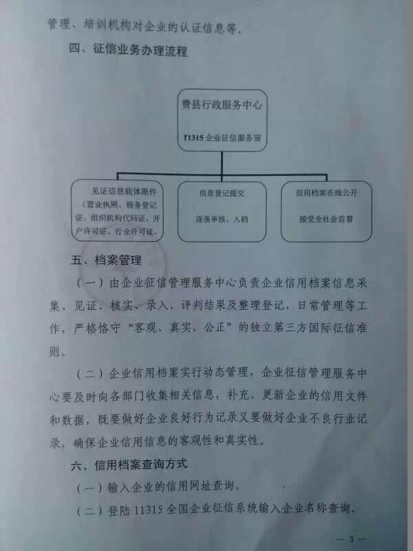 文件中提出,为切实推进费县企业诚信体系建设,树立企业诚信守信的良好风尚,促进第三方公众征信的推广应用,全面贯彻落实《国务院关于印发社会信用体系建设规划纲要(2014-2020)的通知》要求,根据国务院《征信业管理条例》国家发改委、人民银行、中央编办《关于在行政管理事项中使用信用记录和信用报告若干意见的通知》,费县将建立企业信用档案制度。