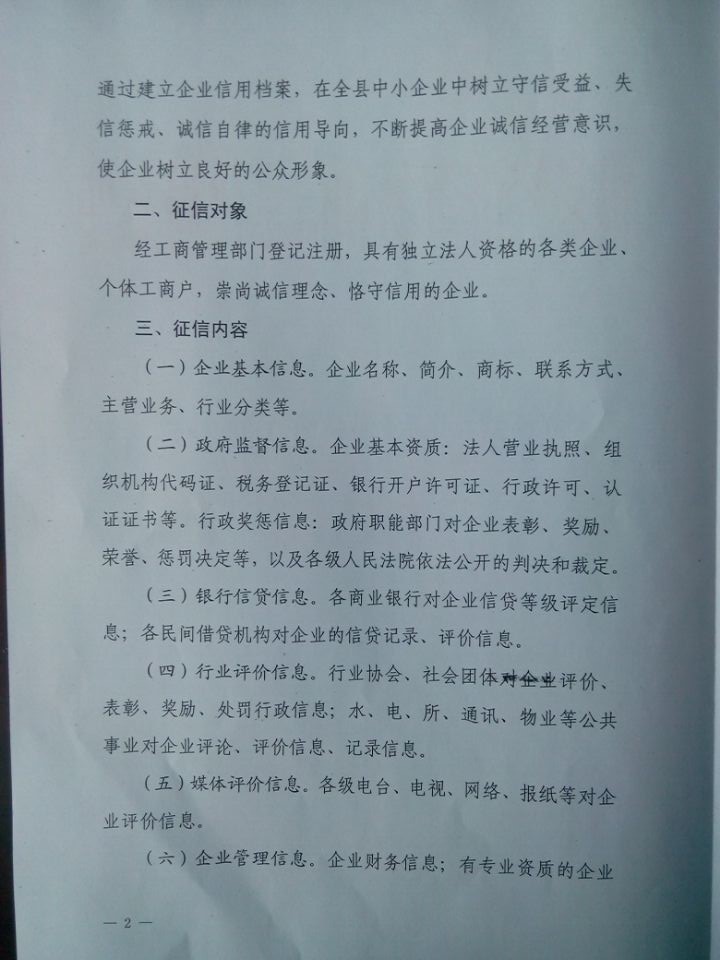 此次企业征信对象是经工商管理部门登记注册,具有独立法人资格的企业和个体工商户。征信内容包括企业基本信息、政府监督信息、银行信贷信息、行业评价信息、媒体评价信息、企业管理信息等。其中,政府监督信息包括企业基本资质、行政奖惩信息以及各级人民法院依法公开的判决裁定;银行信贷信息包括各商业银行对企业信贷等级的评定信息、民间借贷机构对企业的信贷记录、评价信息;行业评价信息包括行业协会、社会团体对企业的评价、表彰、奖励、处罚行政信息,公共事业对企业的评价、记录信息;媒体评价信息包括各级传统及新兴媒体对企业的评价信息;企业管理信息包括企业财务信息、有专业资质的企业管理培训机构的对企业的认证信息等。